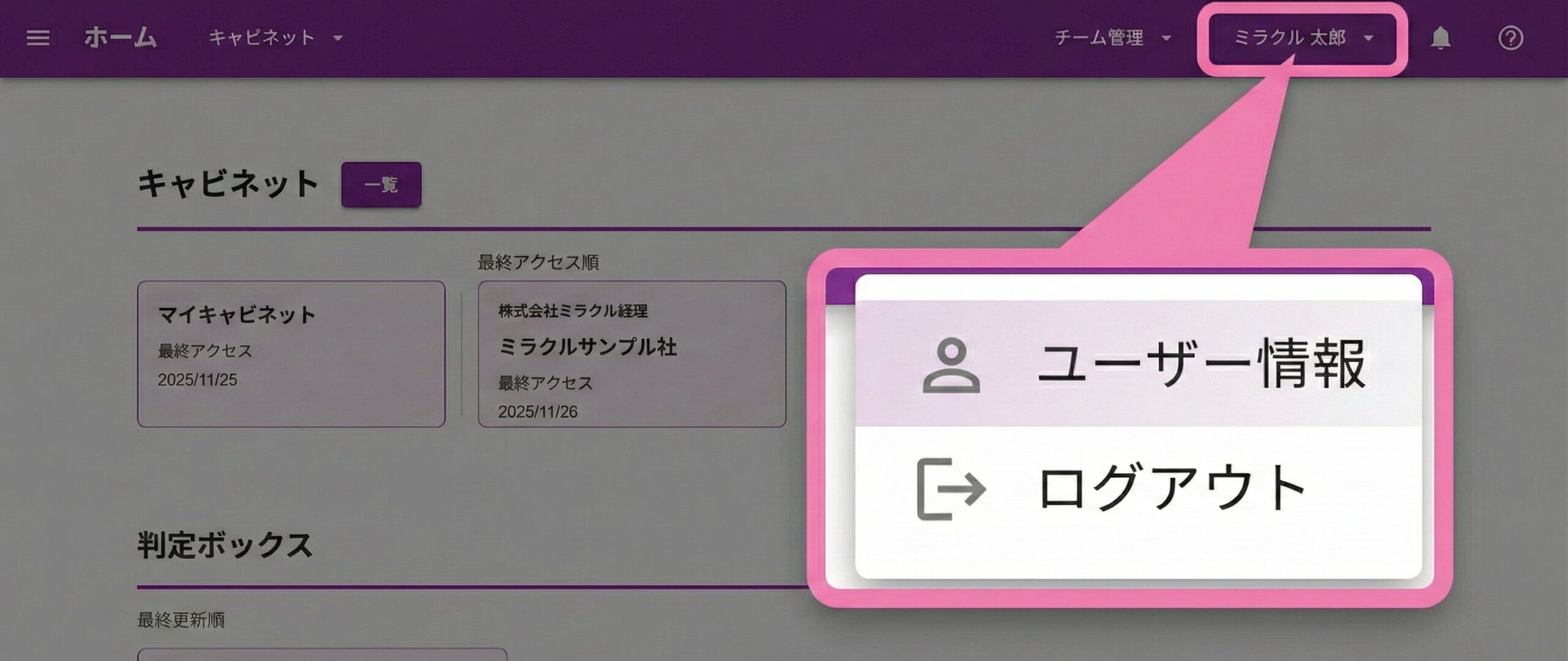 トップバーのユーザー名から「ユーザー情報」をクリックしてください。