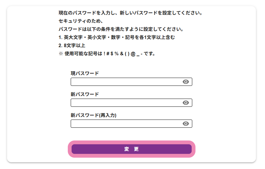 現在のパスワードを入力し、新しいパスワードを設定してください。